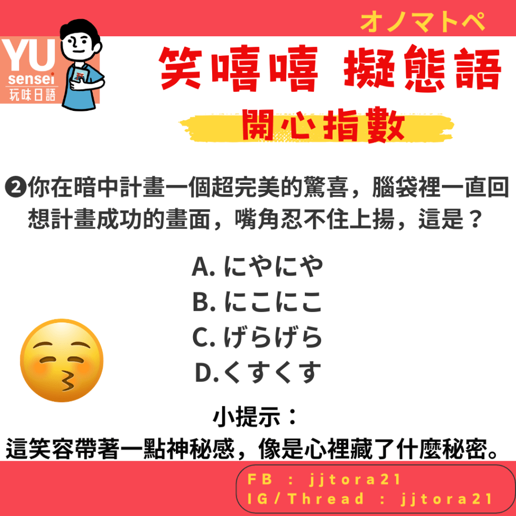 例:聽到別人講的冷笑話,雖然不想笑但還是忍不住。 - にやにや:有點壞壞的笑容,像是心裡藏著什麼好事。