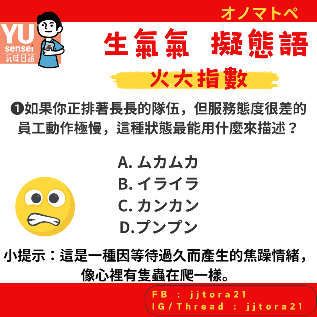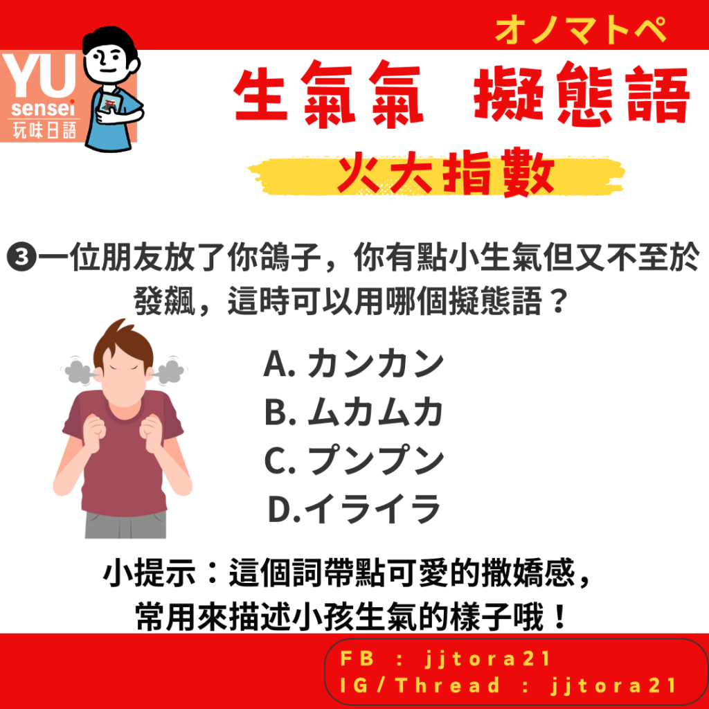 小測驗時間到!YU老師準備了3道「生氣擬態語」的小問題,快來挑戰看看!!