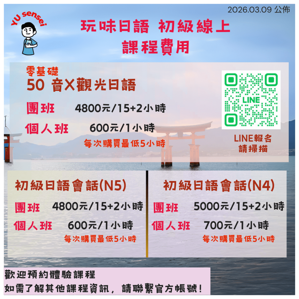✨ 目標: 讓學員掌握50音發音,並能在旅遊時用簡單日語溝通點餐、問路、購物、搭車等基本情境!